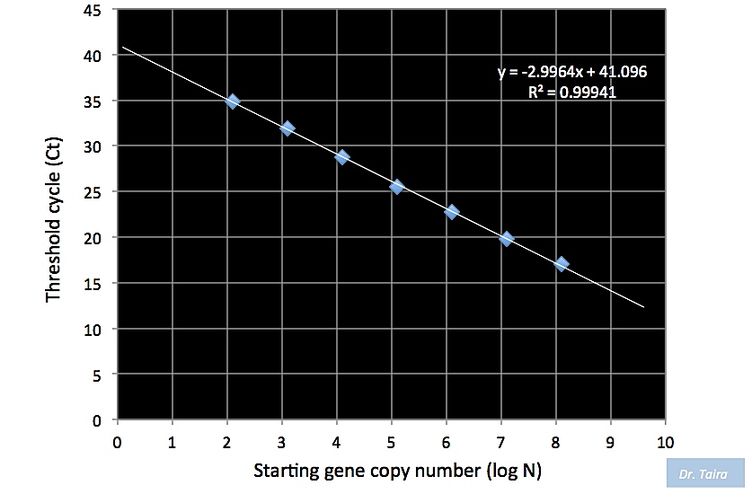 図1. TaqMan PCRの反応液中の初発遺伝子コピー数とCt値との関係. 既知濃度の細菌DNA断片溶液 [アンモニア酸化酵素遺伝子amoA] を10倍段階希釈したサンプルで得られたCt値(筆者未発表データ). 10コピーはCt=38、1コピーはCt=41に相当. このデータでの閾値のラインは蛍光シグナルの立ち上がりが直線的になったところで決定しているので、閾値ラインを立ち上がりのギリギリまで下げればCt値は2ほど低くなる(すなわち、10コピーはCt=36、1コピーはCt=39程度になる).