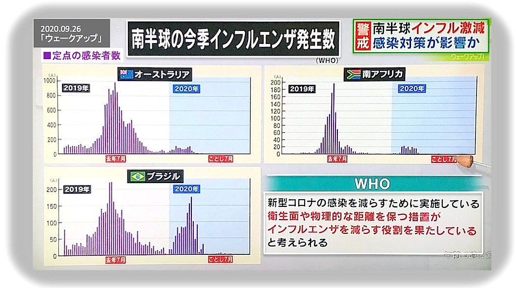 図1. テレビが伝えるオーストラリア、南アフリカ、ブラジルにおけるインフルエンザの新規患者数/日の推移(2020.09.26 日本TV 「ウェークアップ」より).